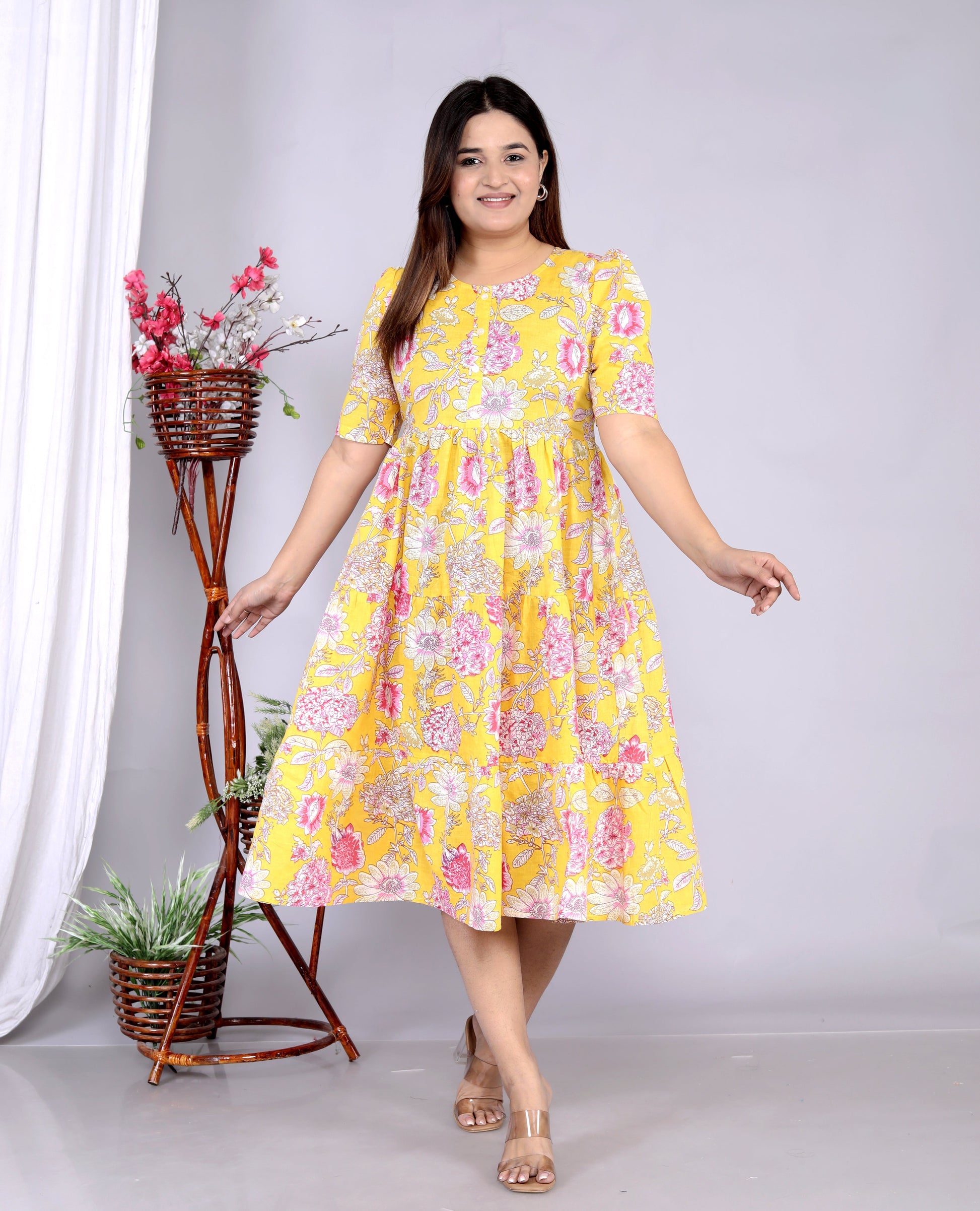 Women Yellow Floral Cotton Middi Gown
