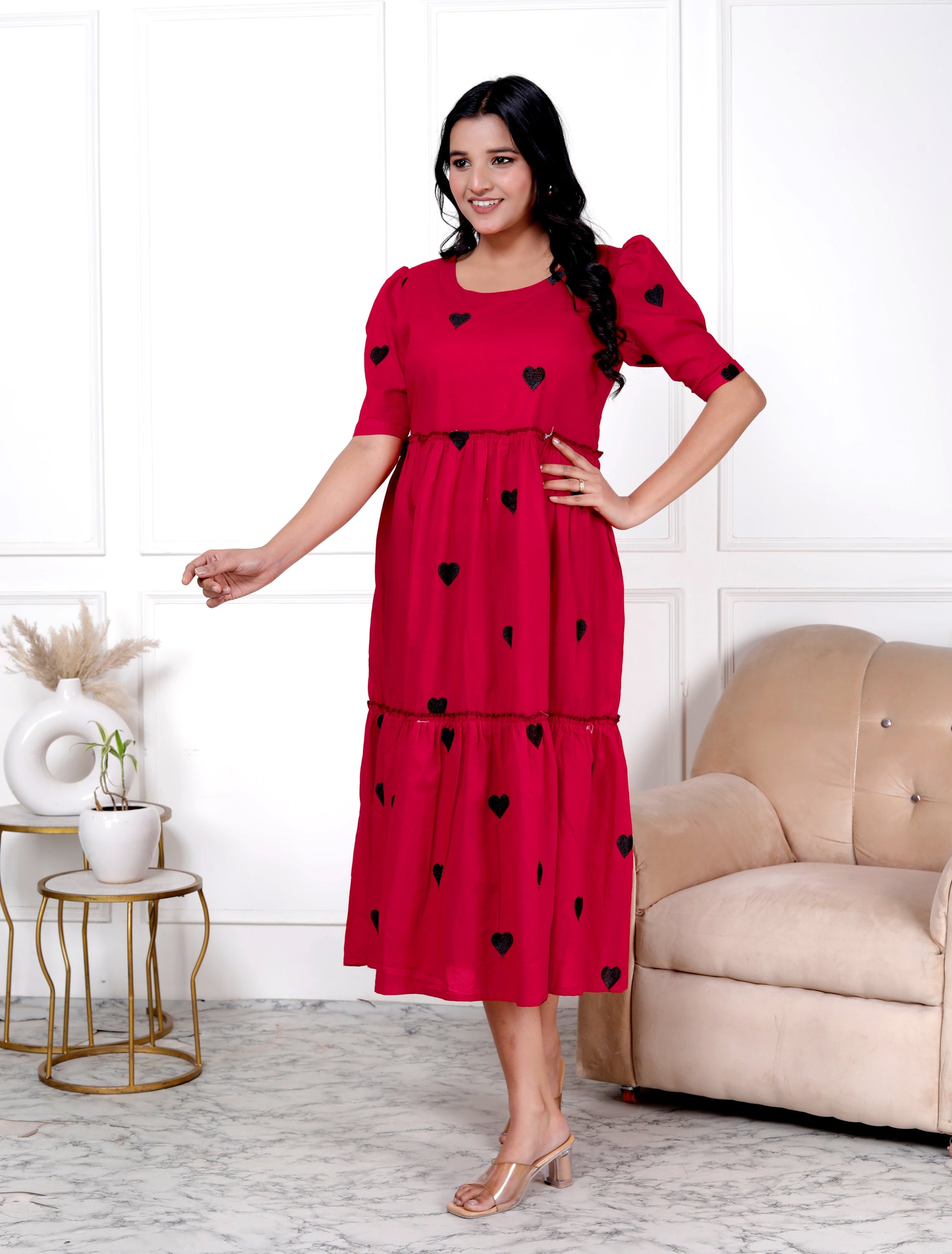 Women Embroidery Heart Red Middi Gown