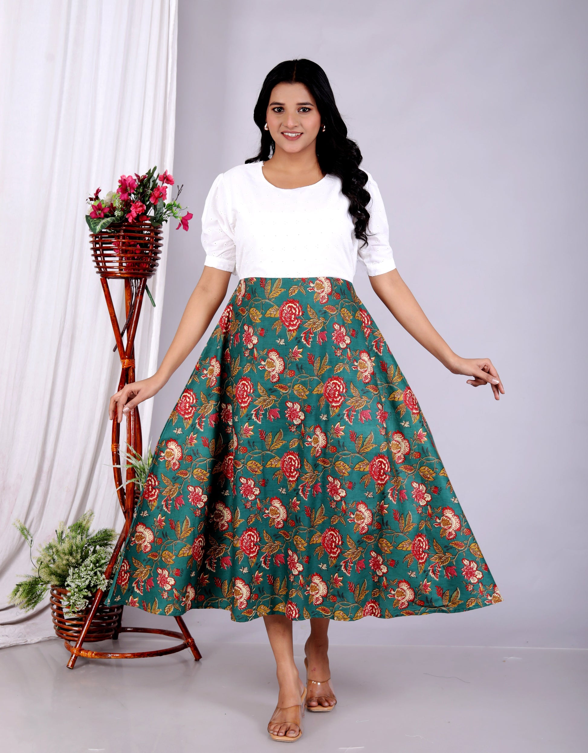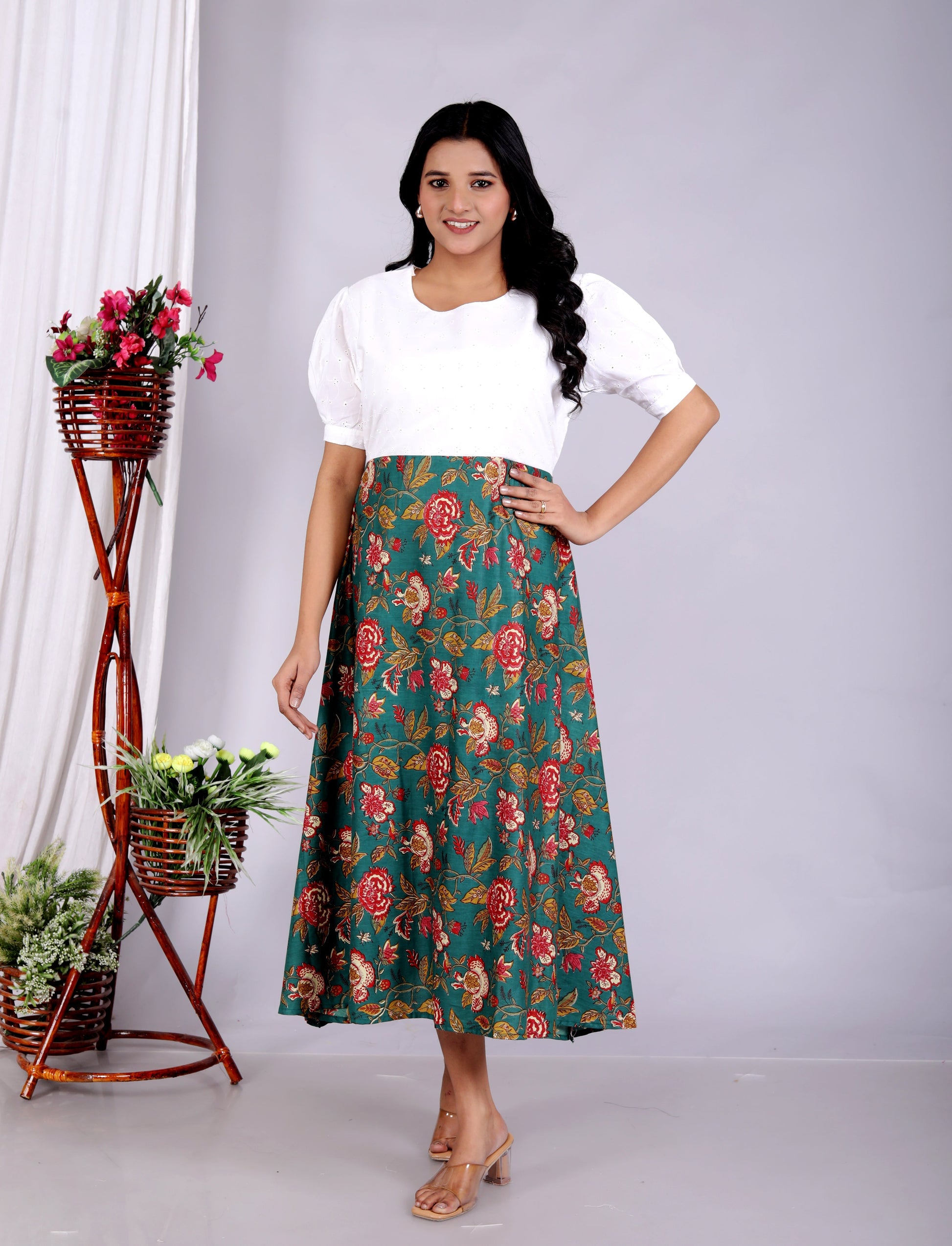 Women Schifli Green Multicolor Cotton Middi Gown